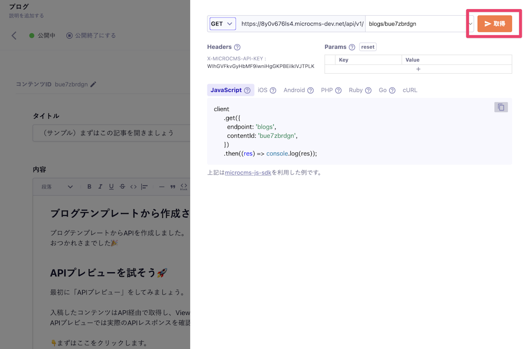 APIプレビュー画面が開いたら、「取得」ボタンでリクエストを試してみましょう。
